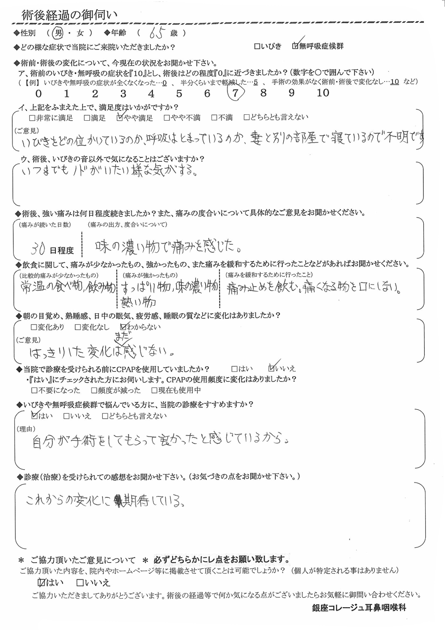 ア, 術前のいびき・無呼吸の症状を『10』だったとすると、術後はどの程度になりましたか? 【7】