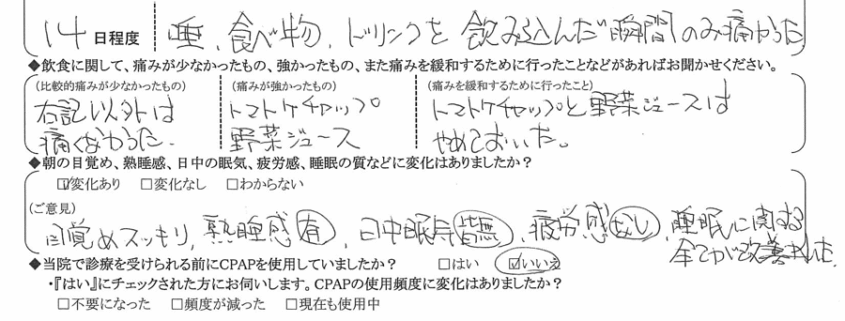 (痛みの程度について) 唾、食べ物、ドリンクを飲み込んだ瞬間のみ痛かった。