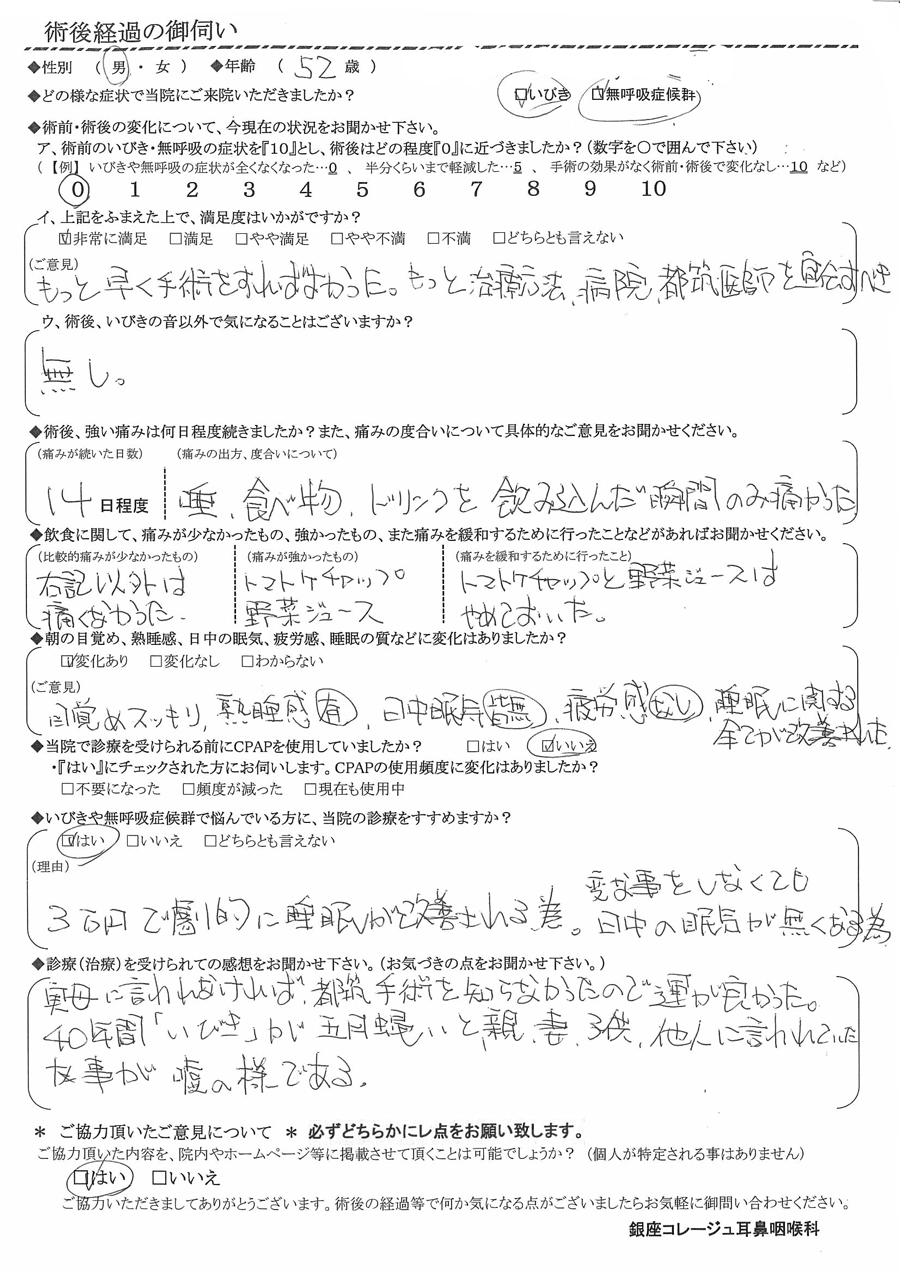 A: 実母に言われなければ、都筑手術を知らなかったのと運が良かった。40年間「いびき」が五月蝿…と、親、妻、子供、他人に言われていた事が嘘の様である。
