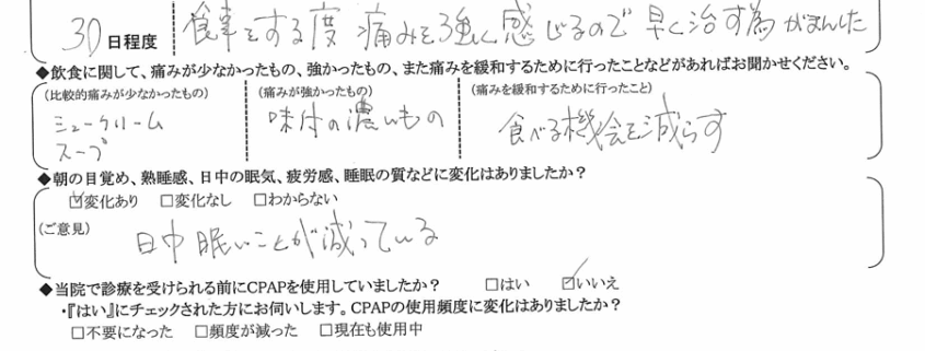(痛みの程度について) 食事をする度、痛みを強く感じるので早く治す為がまんした