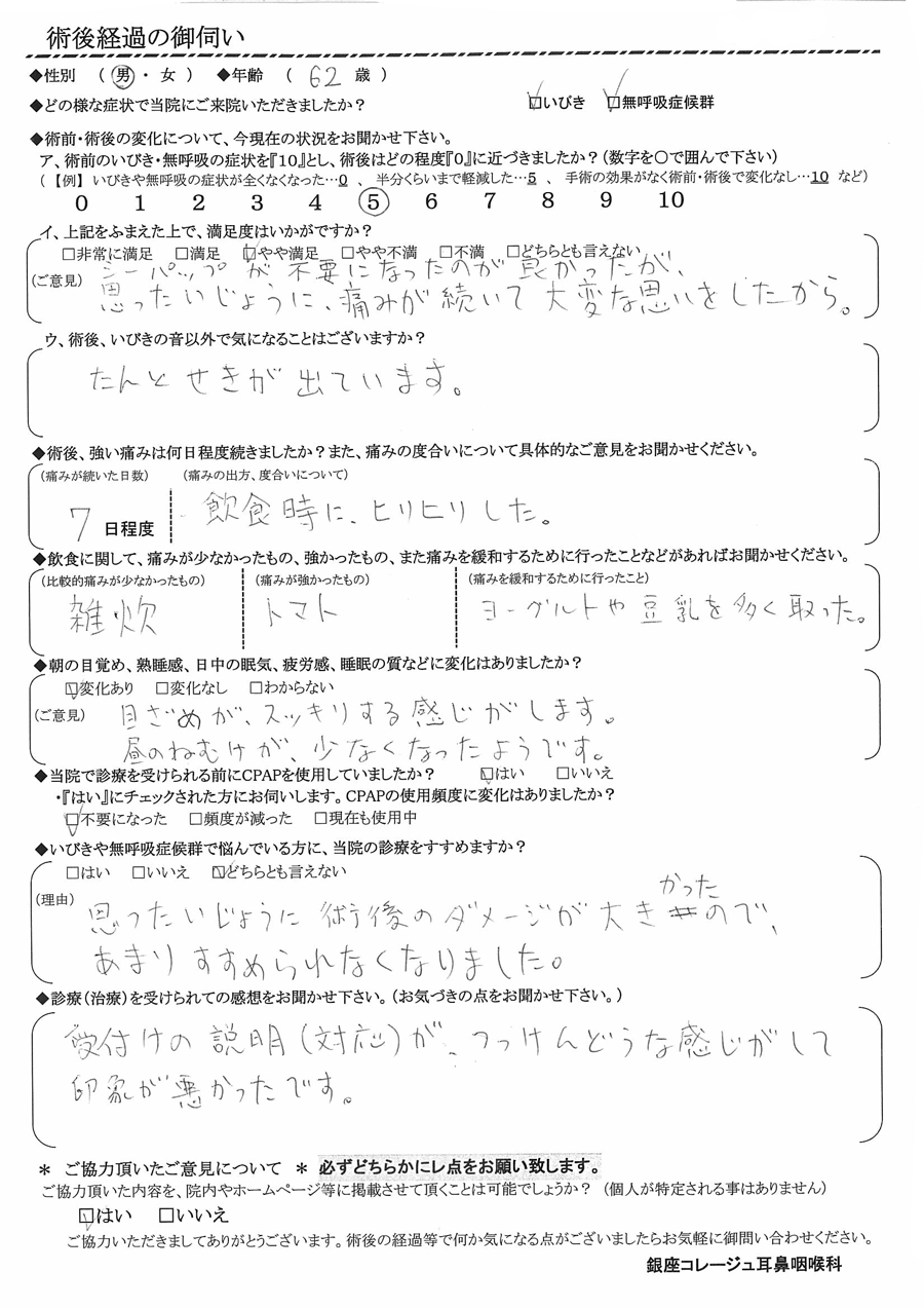 (ご意見) シーパップが不要になったのが良かったが、思った以上に、痛みが続いて大変な思いをしたから。