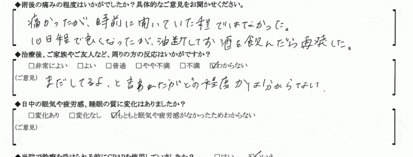 (ご意見) 結婚前に手術したので、手術前にどの程度いびきをしていたのかいまいち分からず、以前と現在の