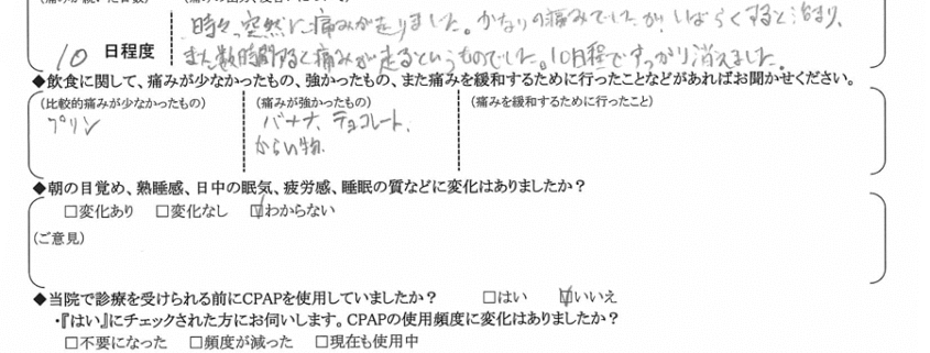 (ご意見) 無呼吸がなくなって本当によかったです。またいびきもかなり軽減されてよかったです。