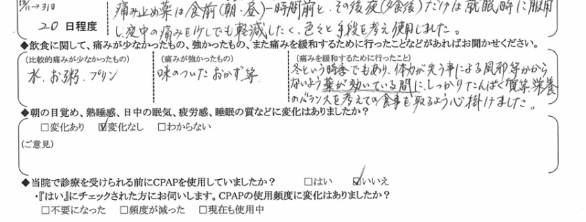 A:(痛みを緩和するために行ったこと) 冬という時期もあり、体力が失う事による風邪等かからないよう薬が効いている間にしっかりたんぱく質等、栄養のバランスを考えて食事を取るよう心掛けました。