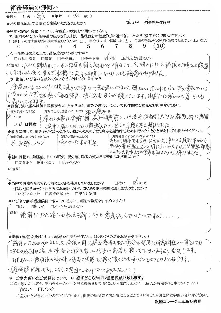 (ご意見) とにかく期待をしてのよい結果を得られるものと明日こそ、又明日にはと術後の2ヶ月以上経過しましたが、全く変わらず予想に反する結果にとてもとても残念でなりません。