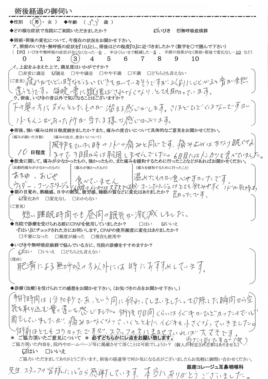 A: 手術時間は1分30秒であっという間に終わってしまいました。切除した瞬間から空気を取り込む量の違いを感じました。術後7日間位はイビキが酷かったので心配をしていましたが、痛みがなくなっていくとともにイビキも小さくなっていきました。術前はとても怖かったですが、スッタフの方にまかせていれば大丈夫です。当たり前ですが(笑)