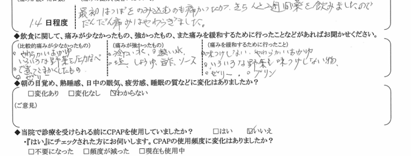 (痛みの程度について) 最初は唾を飲み込むのも痛かったが、きちんと2週間薬を飲みましたので、だんだん痛みは和らぎました。