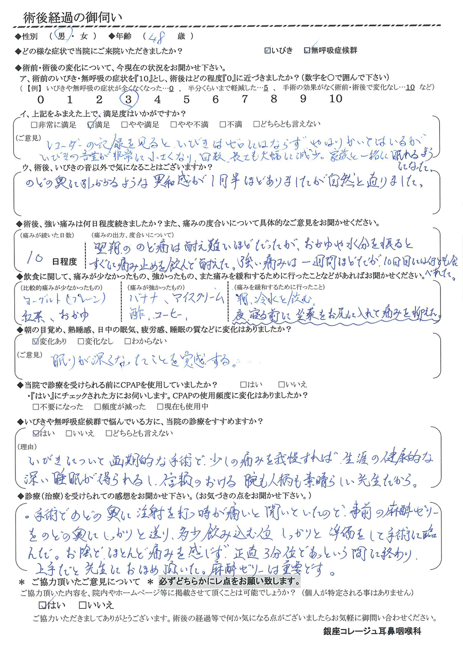 (理由) いびきについて画期的な手術で、少しの痛みを我慢すれば生涯の健康的な深い睡眠が得られるし、信頼のおける腕も人柄も素晴らしい先生だから。