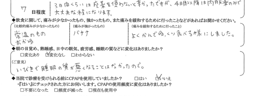 A:(痛みを緩和するために行ったこと) よく噛んでゆっくり食べる様にしました