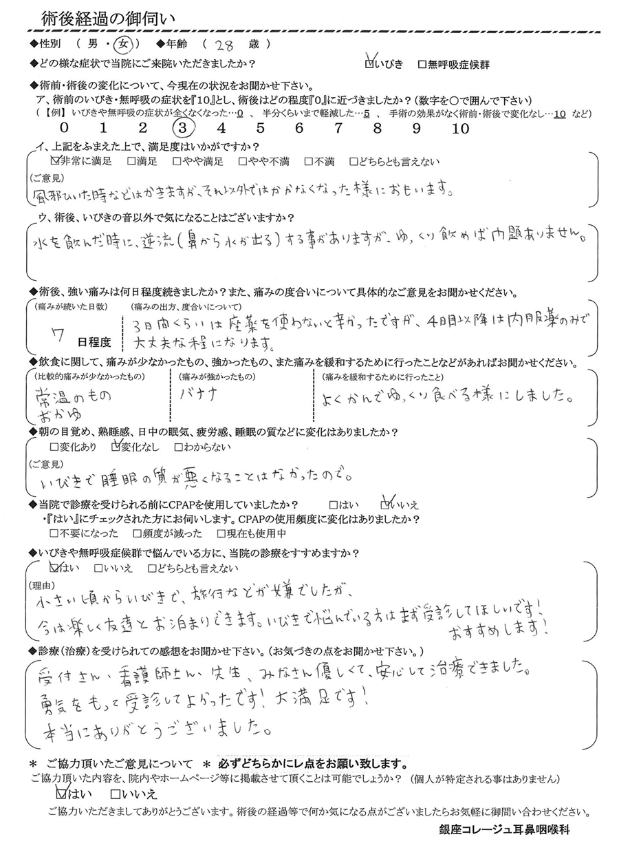 (理由) 小さい頃からいびきで、旅行などが嫌いでしたが、今は楽しくお友達とお泊りできます。