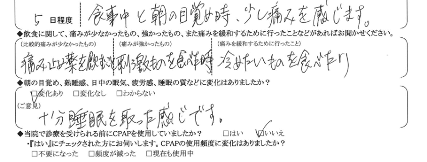 (痛みの程度について) 食事中と朝の目覚め時、少し痛みを感じます。