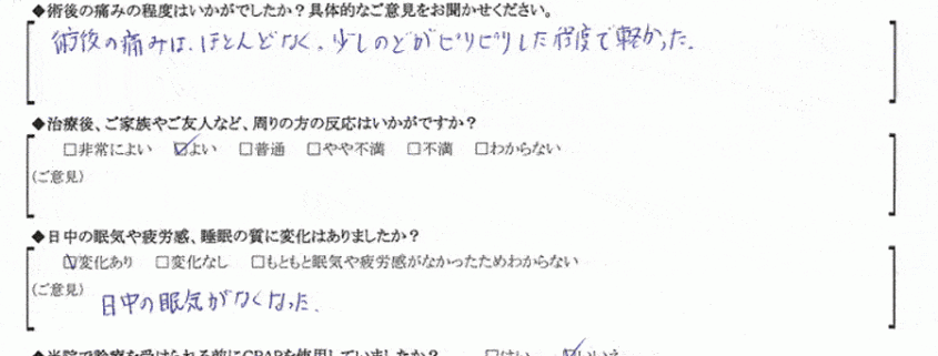 A:私は睡眠時無呼吸症候群の治療のため手術を受けたが本当に簡易な手術で、手術中、術後ともあまり痛みがなかった。また睡眠も徐々に深くなり手術を受けて本当に良かったと感じています。
