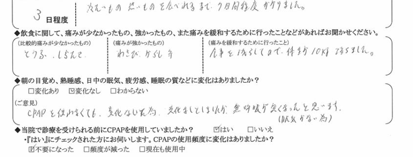 (ご意見) CPAPを使わなくても変化ない為、変化なしとはしましたが、無呼吸が無くなったと思います。