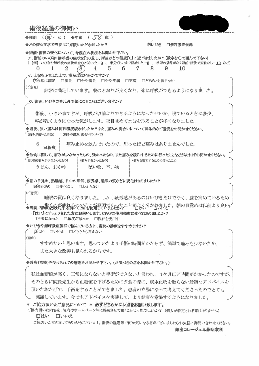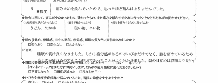 (ご意見)  睡眠の質は良くなりました。しかし、疲労感があるのはいびきだけでなく、膝を痛めているため歩くのが疲れるので、そこが原因であったことがよく分かりました。朝の目覚めは以前より良い。