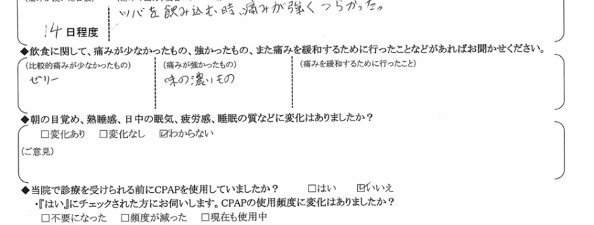 (痛みの程度について) 唾を飲み込む時、痛みが強く辛かった。