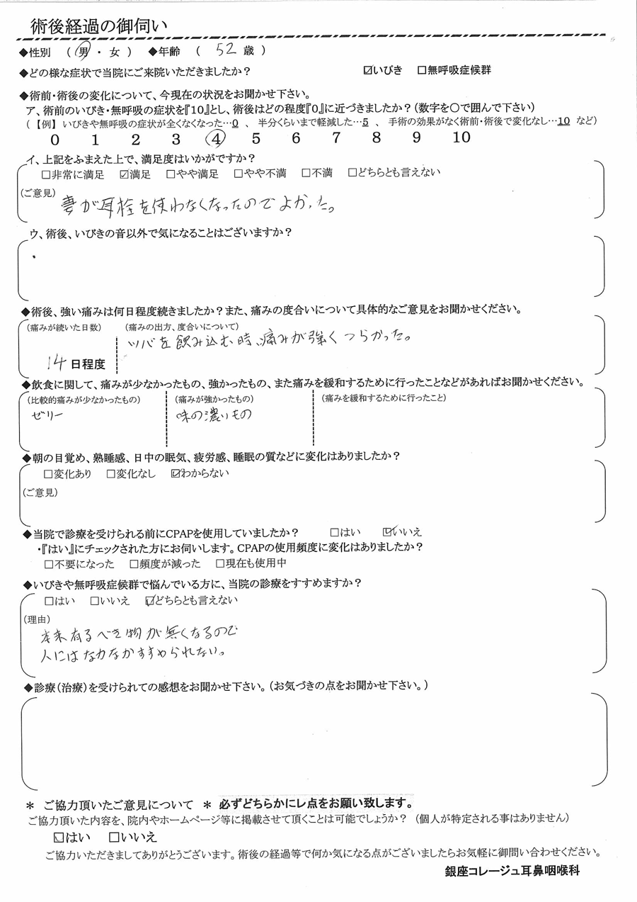 ア, 術前のいびき・無呼吸の症状を『10』だったとすると、術後はどの程度になりましたか? 【4】