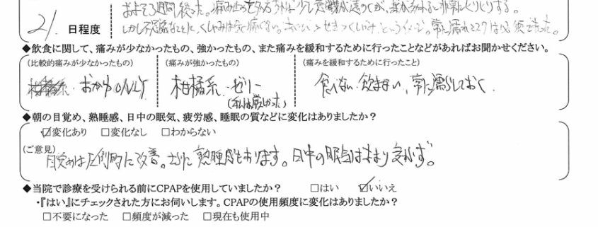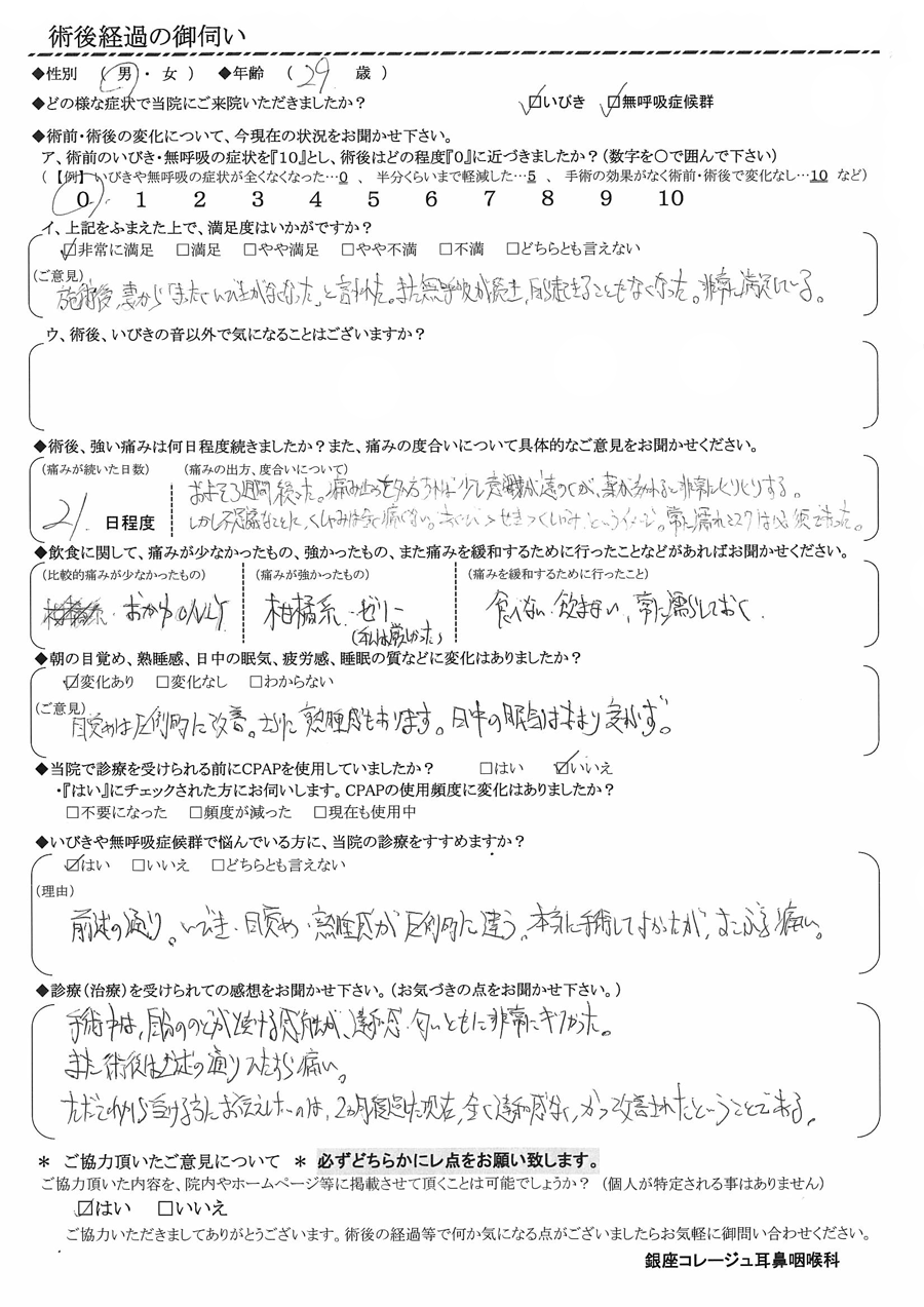 (ご意見) 施術後、妻から「全くいびきが無くなった」と言われた。また、無呼吸が続き、自ら起きる事もなくなった。非常に満足している。