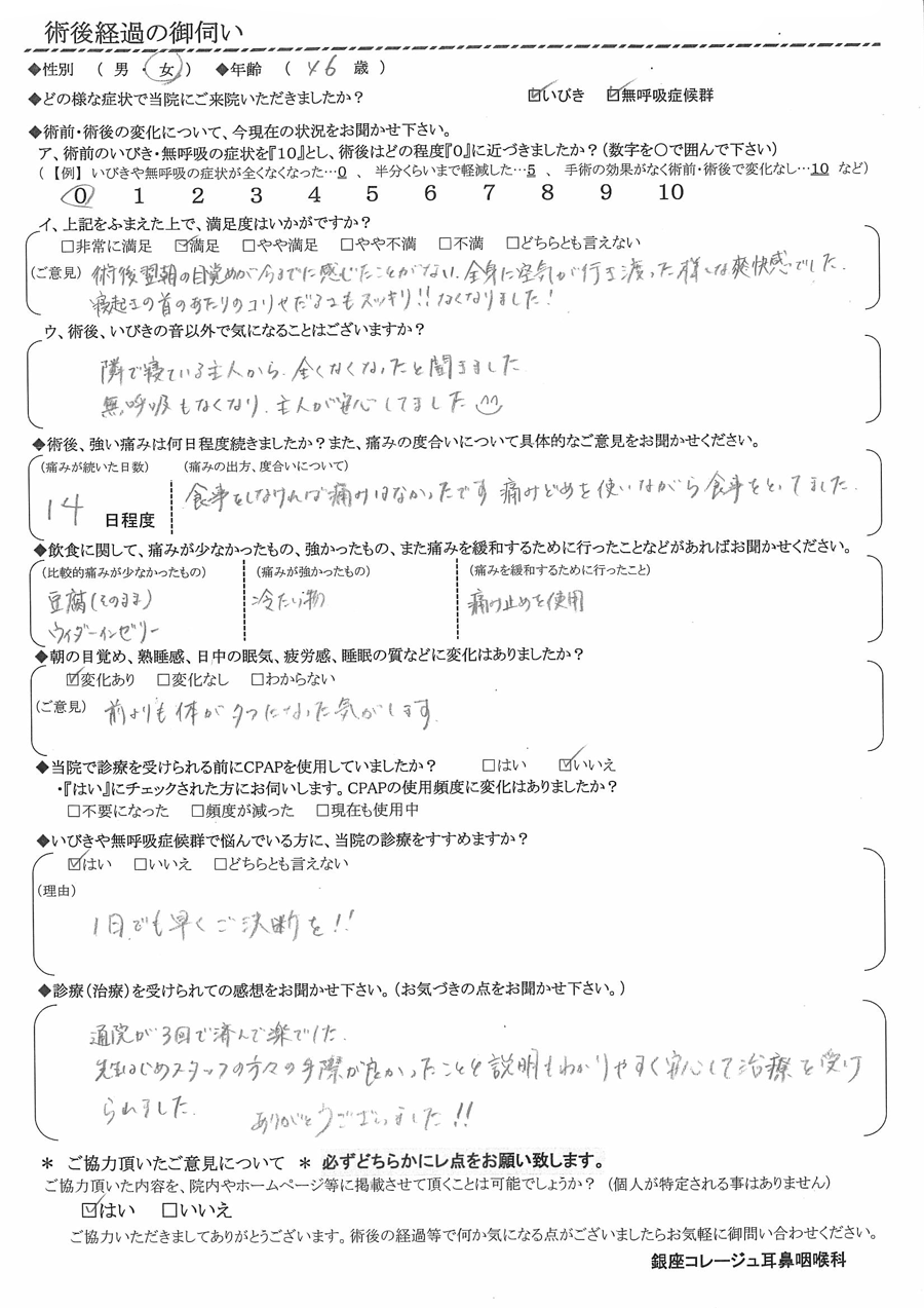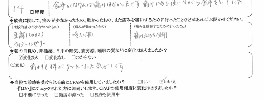 (ご意見) 術後翌朝の目覚めが今までに感じたことがない、全身に空気が行き渡った様な爽快感でした。