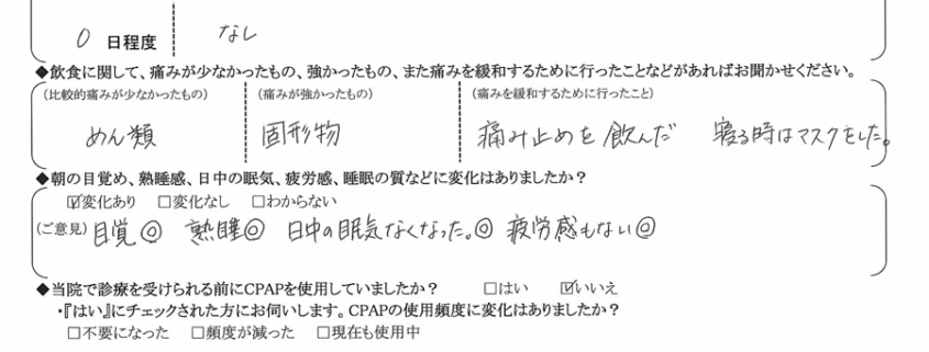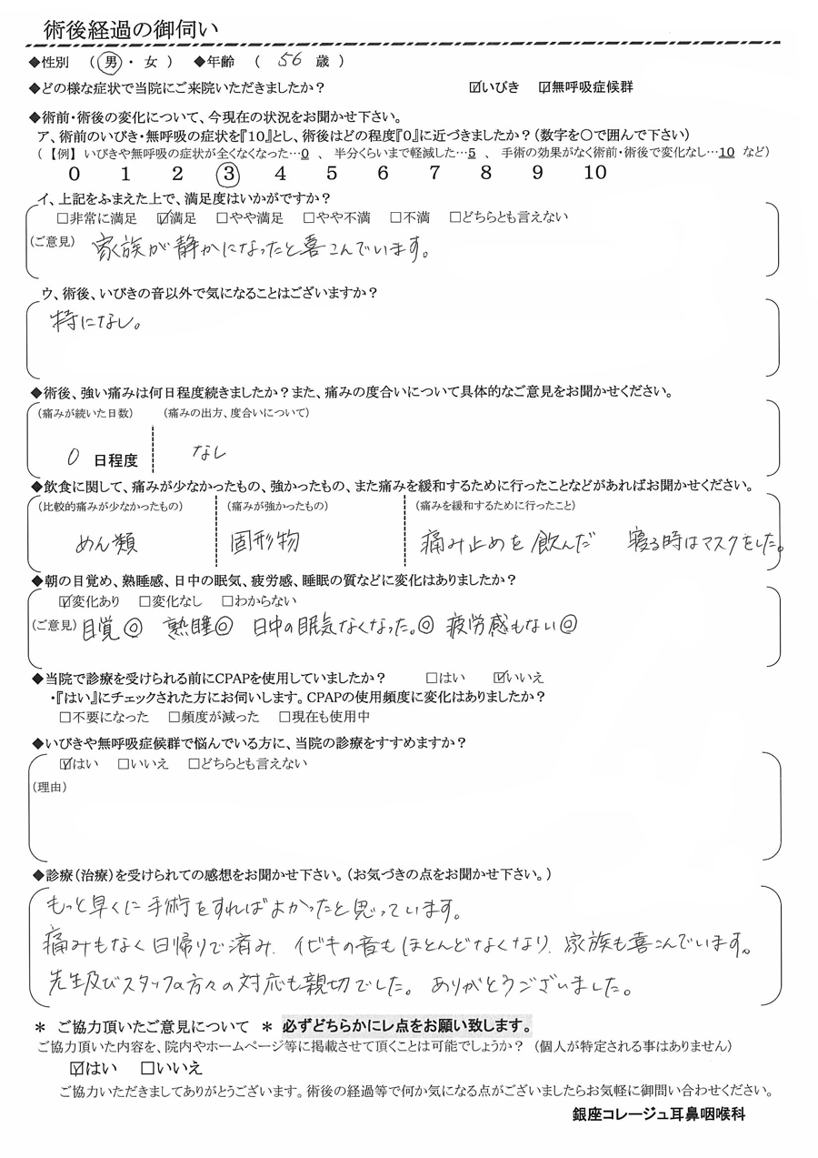 A: もっと早くに手術をすれば良かったと思っています。痛みも無く日帰りで済み、イビキの音もほとんど無くなり家族も喜んでいます。先生及びスタッフの方々の対応も親切でした。ありがとうございました。
