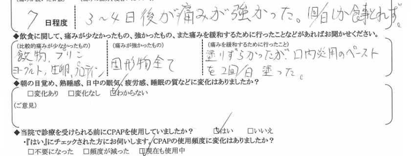 (痛みの程度について) 3~4日後から痛みが強かった。1回/日しか食事とれず。