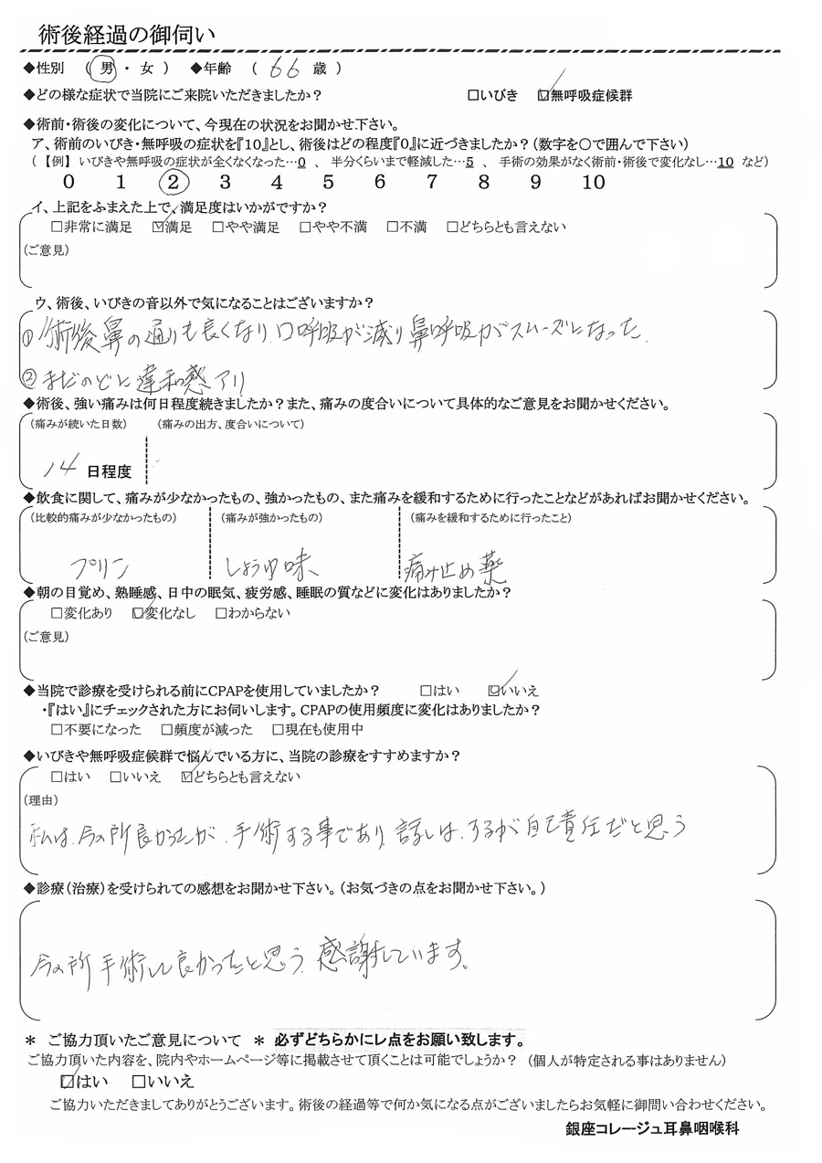 ア, 術前のいびき・無呼吸の症状を『10』だったとすると、術後はどの程度になりましたか? 【2】