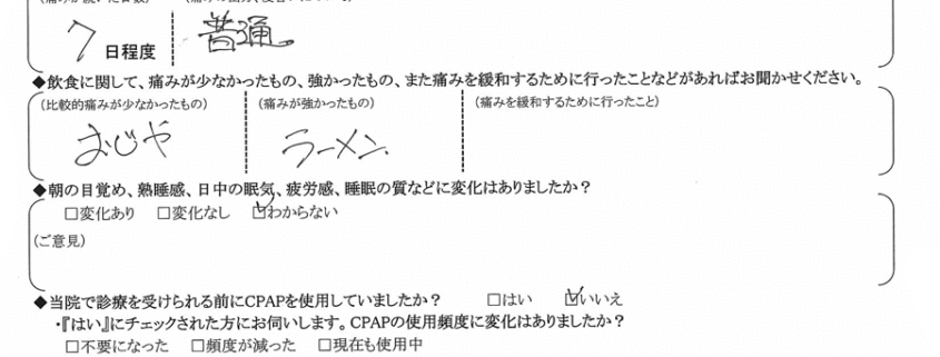 Q.術後、強い痛みは何日程度続きましたか?また、痛みの度合いについて具体的なご意見をお聞かせください。