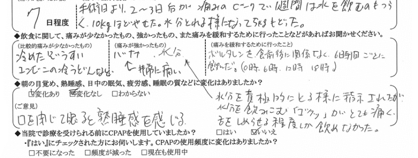 (痛みの程度について) 手術日より2~3日後が痛みのピークで、1週間は水を飲むのも辛く、10㎏ほど痩せた。