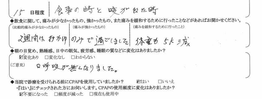 A:(痛みが少なかったもの) 2週間はおかゆのみで過ごしました。体重も5㎏減。
