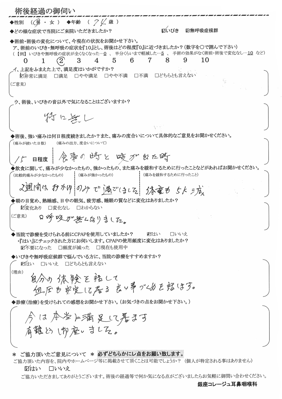 ア, 術前のいびき・無呼吸の症状を『10』だったとすると、術後はどの程度になりましたか? 【2】