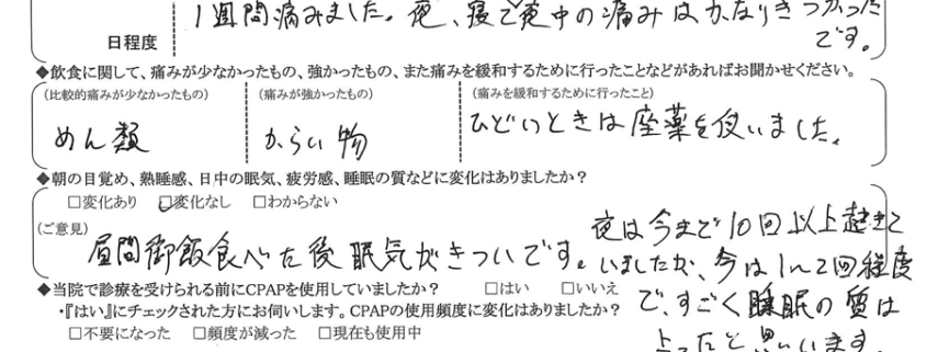 (ご意見)  無呼吸は解消されましたが、寝入りにいびきが出ます。