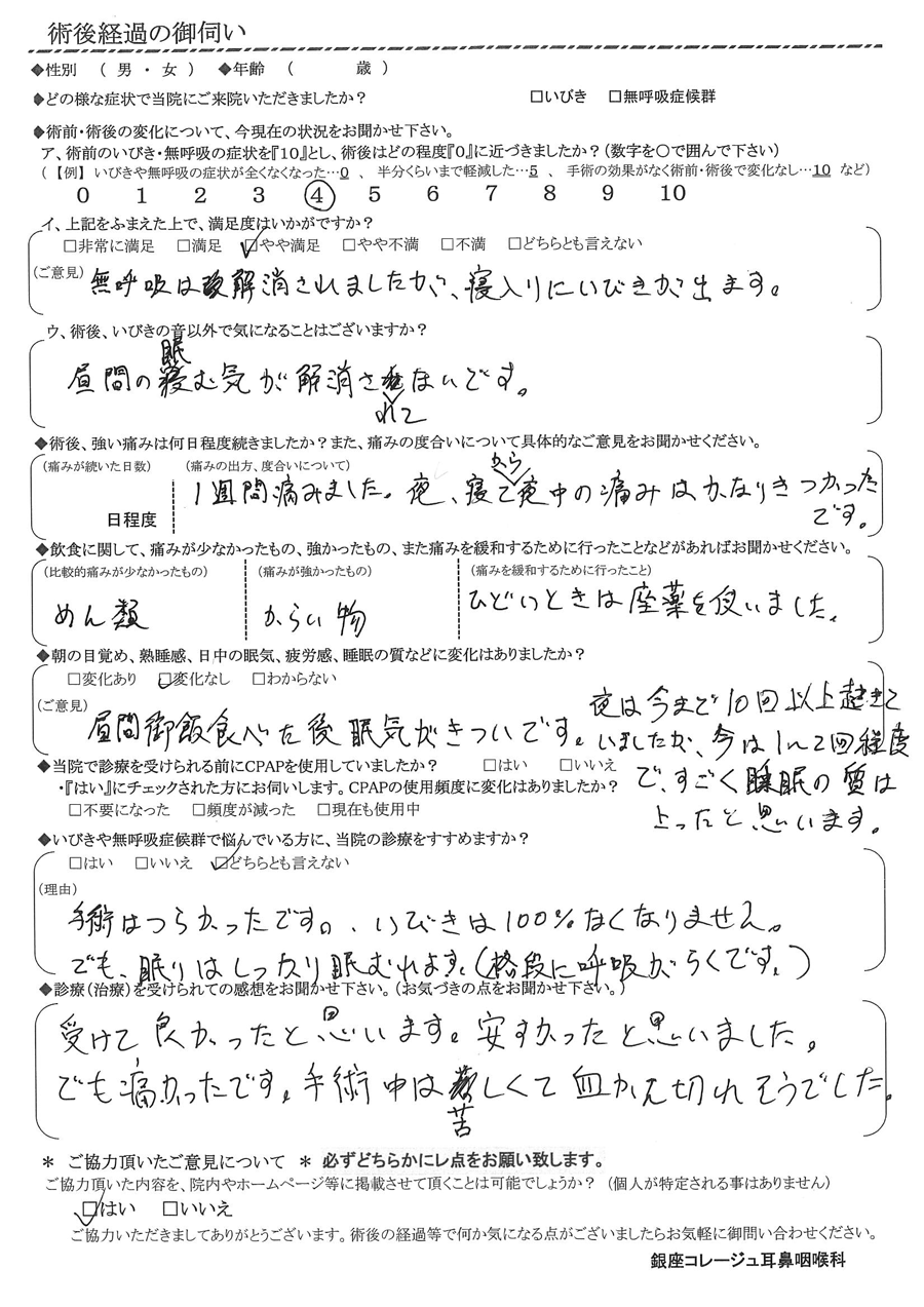 (理由) 手術は辛かったです。いびきは100%無くなりません。でも、眠りはしっかり眠れます。(格段に呼吸が楽です)