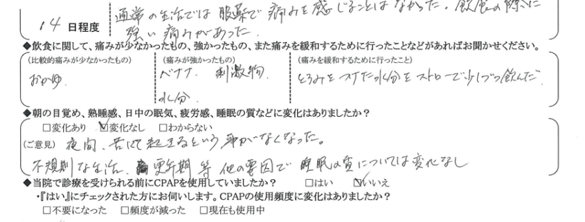 (痛みの程度について) 通常の生活では服薬で痛みを感じる事はなかった。飲食の際に強い痛みがあった。