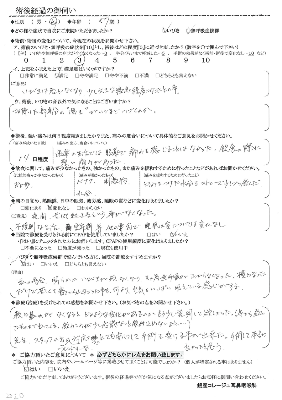 A: 軟口蓋が無くなると、どのような変化があるのかもう少し説明して欲しかった。(鼻から飲んだものが出てくる・飲み込みが少し意識しないと飲み込めないetc…) 先生、スタッフの方のフレンドリーな対応でとても安心して手術を受ける事が出来た。手術して本当に良かったと思う。