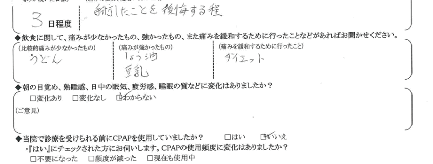 Q.術後、強い痛みは何日程度続きましたか?また、痛みの度合いについて具体的なご意見をお聞かせください。