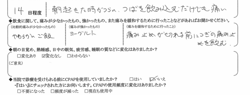 (痛みの程度について) 朝起きた時が辛い。唾を飲み込むだけでも痛い。