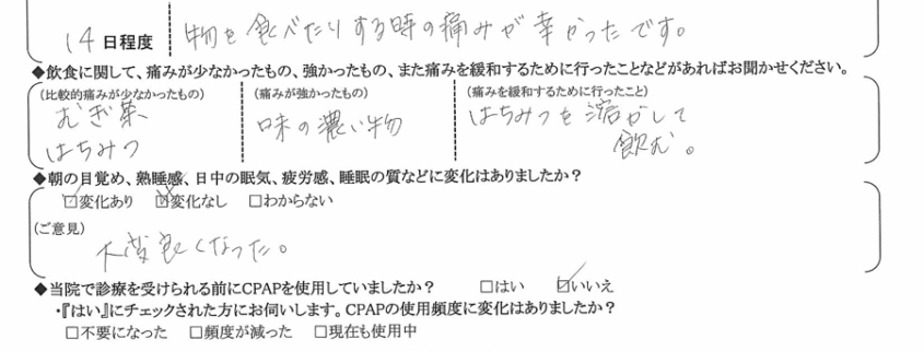 (痛みの程度について) 物を食べたりする時の痛みが辛かったです。