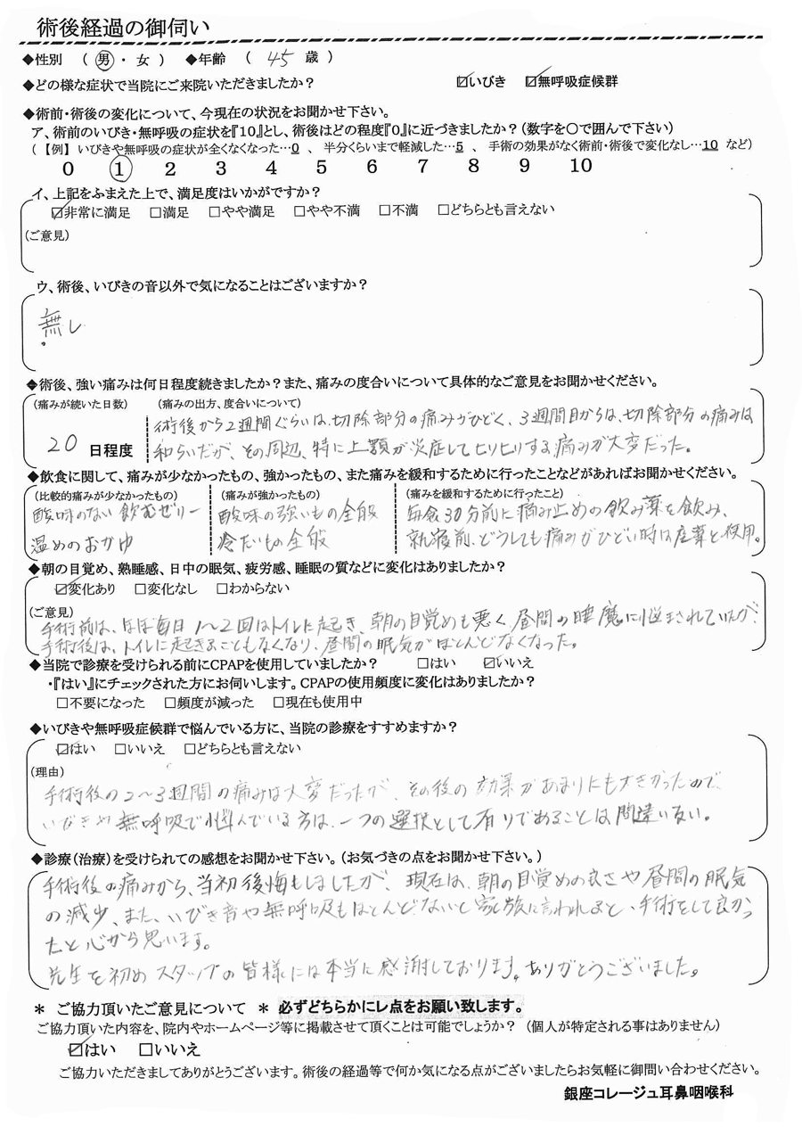 A: 手術後の痛みから、当初後悔もしましたが、現在は朝の目覚めの良さや昼間の眠気の減少、また、いびき音や無呼吸もほとんどないと家族に言われると、手術して良かったと心から思います。先生をはじめスタッフの皆様には本当に感謝しております。ありがとうございました。