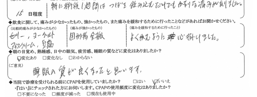 (痛みの程度について) 特に術後1週間はつばを飲み込むだけでもかなり痛みがありました。