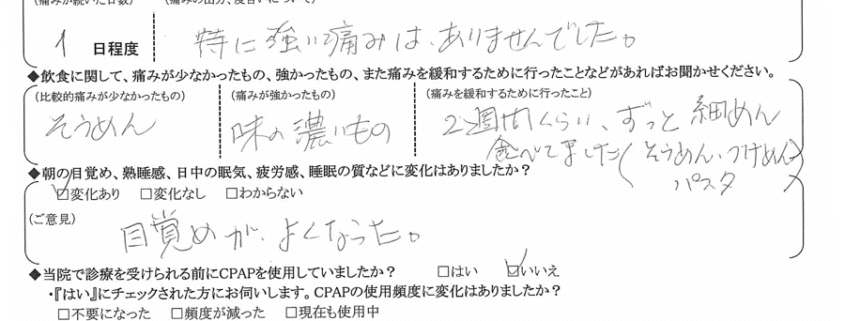 A:(痛みを緩和するために行ったこと) 2週間くらい、ずっと細麺食べてました(そうめん、つけ麺、パスタ)