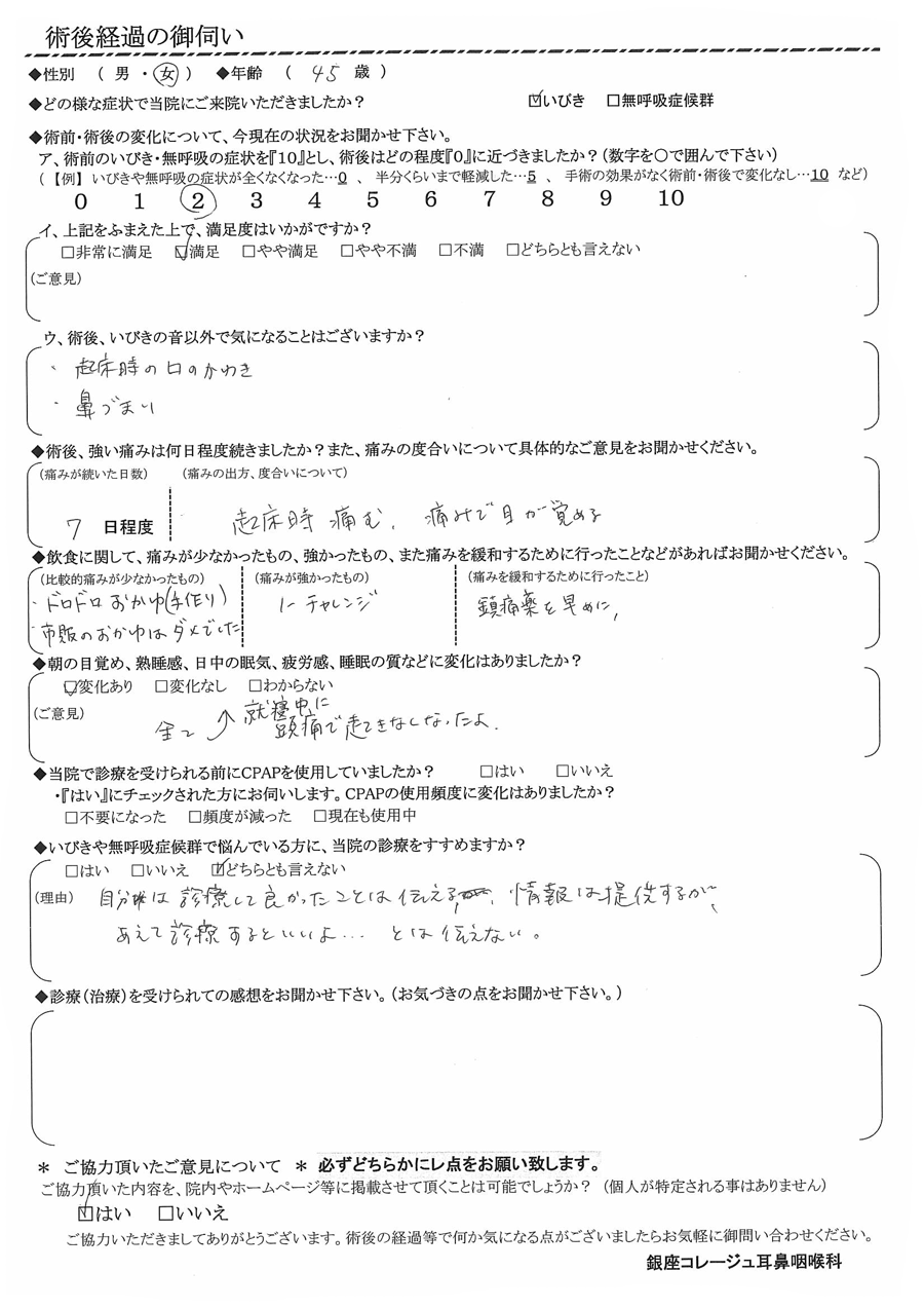 ウ、術後、いびきの音以外で気になる点はございますか?