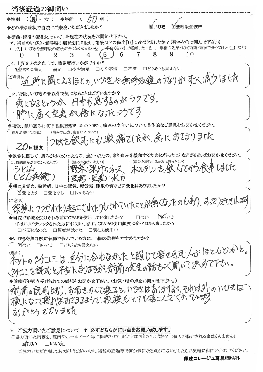 A: 術前の説明通り、お酒を飲んで寝るといびきはありますが、それ以外のいびきは横になって寝ればおさまるようで、家族もとても喜んでくれています。ありがとうございました。