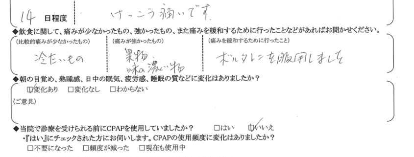 Q.術後、強い痛みは何日程度続きましたか?また、痛みの度合いについて具体的なご意見をお聞かせください。