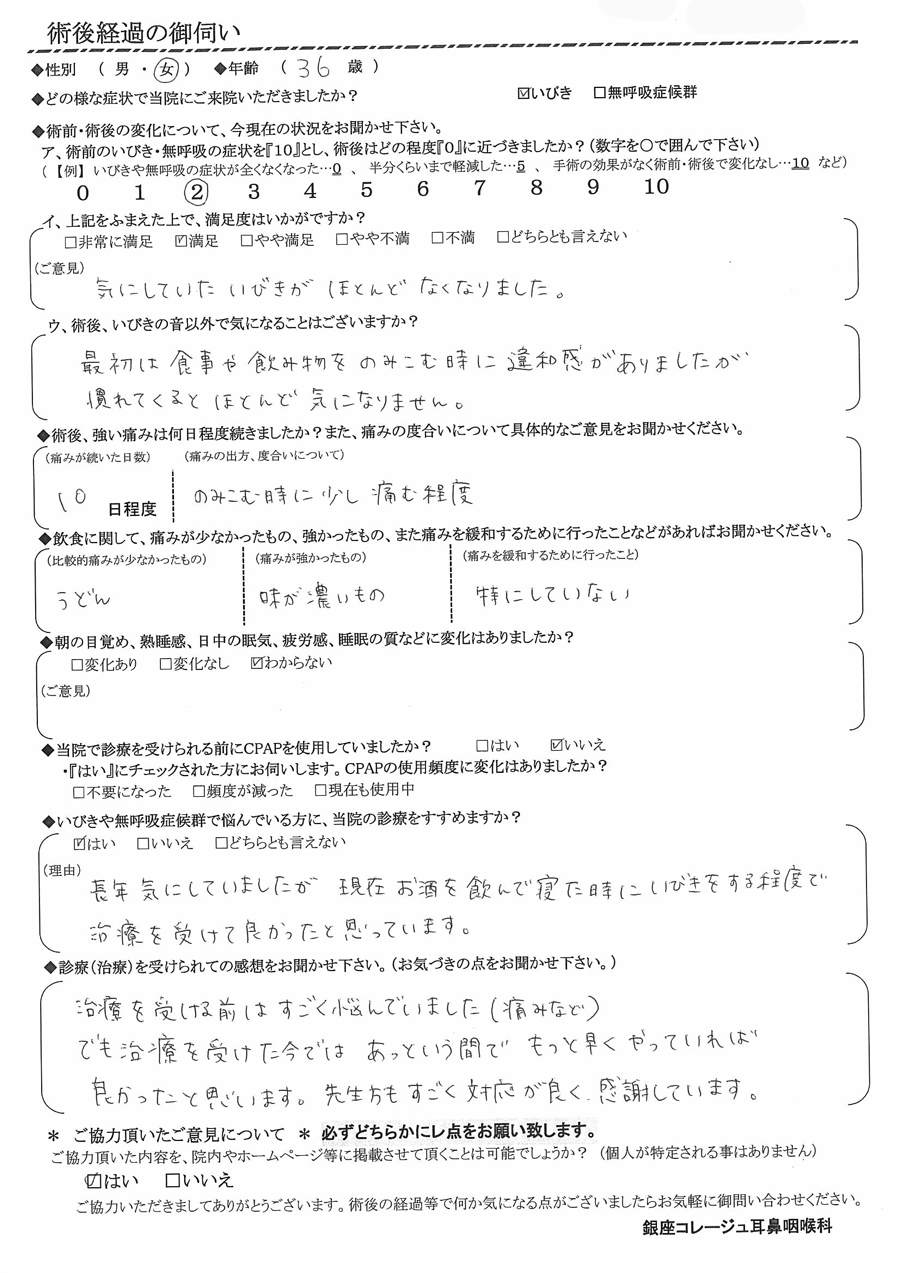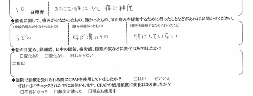 (理由)  長年気にしていましたが、現在お酒を飲んで寝た時にいびきをする程度で治療を受けて良かったと思っています。