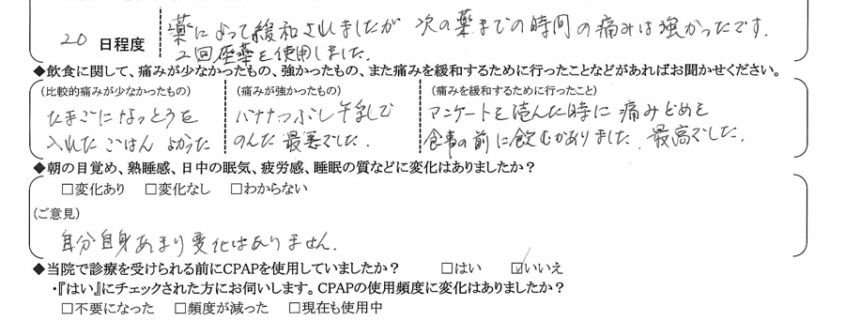 A:(痛みを緩和するために行ったこと) アンケートを読んだ時に痛み止めを食事の前に飲むがありました。最高でした。
