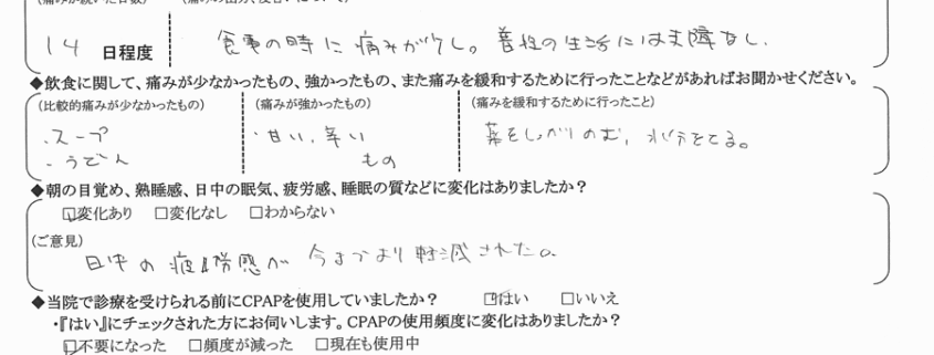 (痛みの程度について) 食事の時に痛みが少し。普通の生活には支障なし。