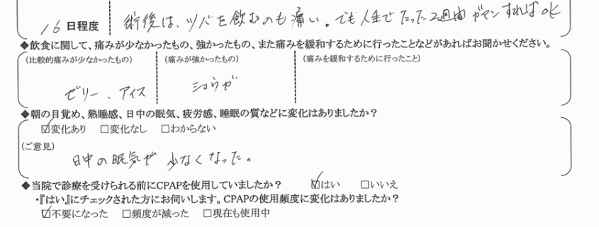 Q.術後、強い痛みは何日程度続きましたか?また、痛みの度合いについて具体的なご意見をお聞かせください。