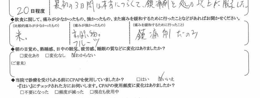 (痛みの程度について) 最初の3日間は本当に辛くて、鎮痛剤を処方以上に服用した。