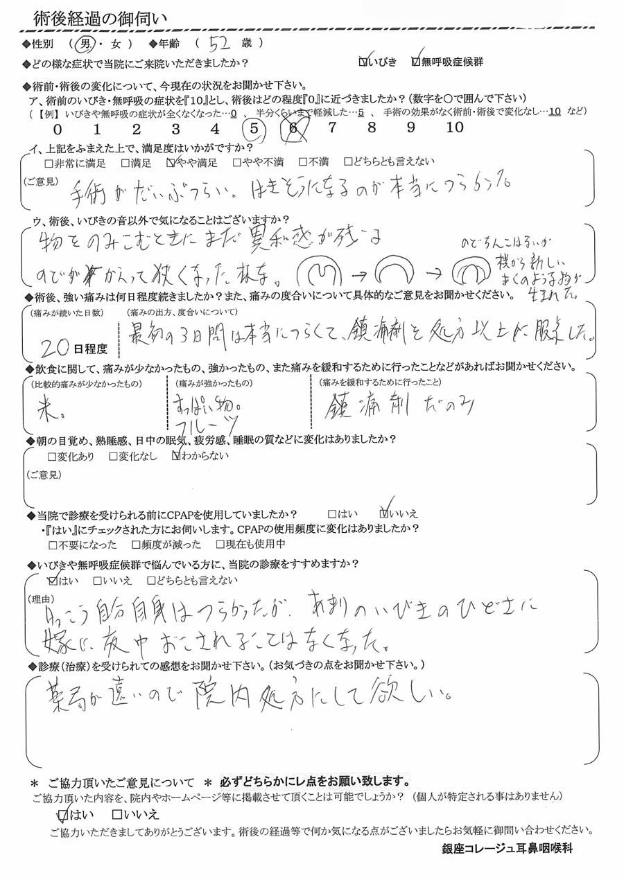 (理由) けっこう自分自身は辛かったが、余りのいびきの酷さに嫁に夜中起こされることはなくなった。