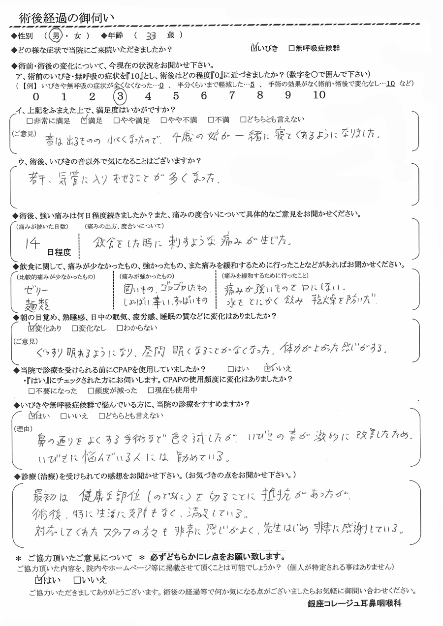 ア, 術前のいびき・無呼吸の症状を『10』だったとすると、術後はどの程度になりましたか? 【3】