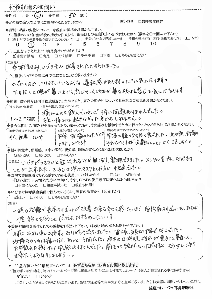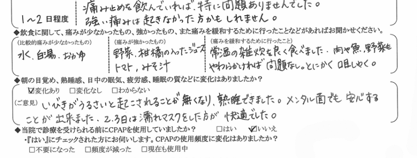 (ご意見)  手術当日より、いびき音が改善されたと言われました。